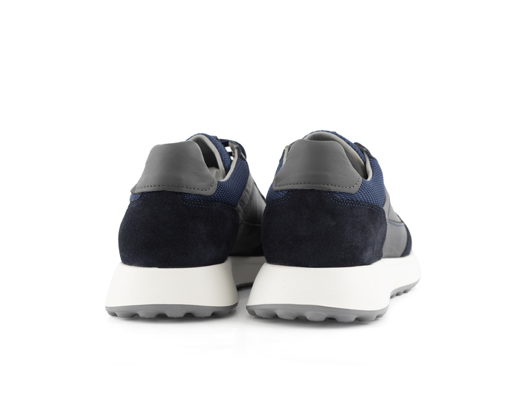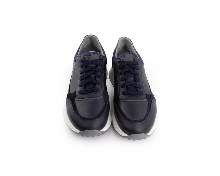 Üçlü Materyal Teknolojisi Tasarımın zenginliği, kullanılan malzemelerin çeşitliliğinden gelir. Ana gövdedeki dayanıklı lacivert deri, burun ve topuk kısımlarındaki süet katmanlarla desteklenerek lüks bir görünüm sunar. Bilek kısmındaki örme kumaş (file) detay ise hava sirkülasyonu sağlayerek ayağınızın gün boyu ferah kalmasına yardımcı olur.