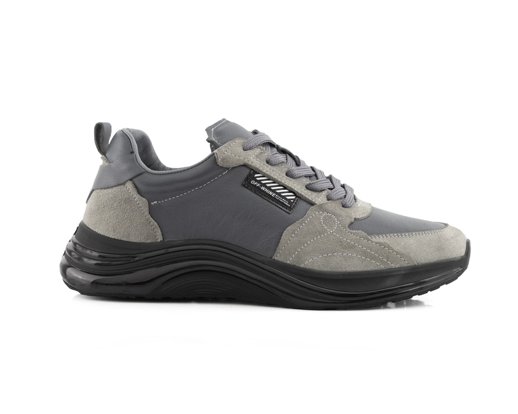 Parçalı ve Katmanlı Tasarım Ayakkabının yüzeyi, tek düze bir renk yerine farklı gri tonlarındaki süet ve tekstil parçaların bir araya gelmesiyle oluşur. Bu "Patchwork" (yamalı) görünüm, ayakkabıya derinlik ve hareket kazandırır. Yan kısımdaki "OFF-WHINE" yazılı şerit etiket, tasarıma endüstriyel ve modern bir hava katar.