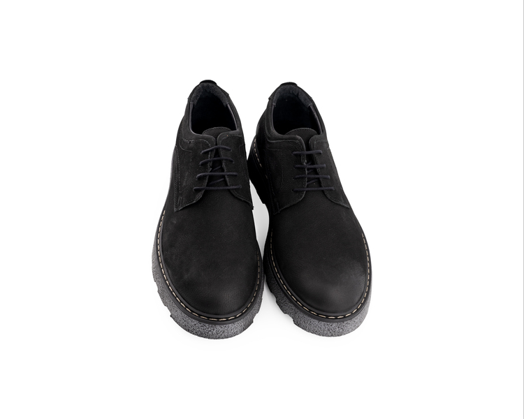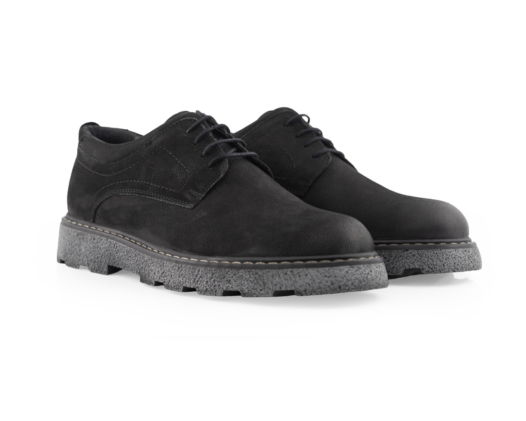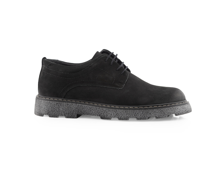 Dokunmak isteyeceğiniz bir kalite! MegaVelvet Trek, siyahın en mat ve asil tonunu yumuşak süet dokusuyla sunuyor. Klasik derby şıklığını, zorlu zeminlere uygun kalın ve pütürlü taban yapısıyla birleştiren bu model, hem ofis stilinize hem de sokak modasına sofistike bir dokunuş katar.